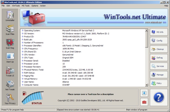 WinTools.net Professional – набор инструментов для оптимизации операционной системы Windows. В состав программы входят компоненты для полного удаления нежелательных программ и «мертвых» ссылок реестра, а также для контроля процессов, настройки системы, интернет-соединений и интерфейса. Кроме того, имеются утилиты для надежного хранения конфиденциальной информации. Работает на платформах Windows 2000, 2003, XP и Vista.
