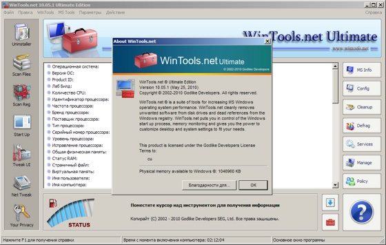 WinTools.net Ultimate – набор инструментов для оптимизации операционной системы Windows. В состав программы входят компоненты для полного удаления нежелательных программ и «мертвых» ссылок реестра, а также для контроля процессов, настройки системы, интернет-соединений и интерфейса. Кроме того, имеются утилиты для надежного хранения конфиденциальной информации.