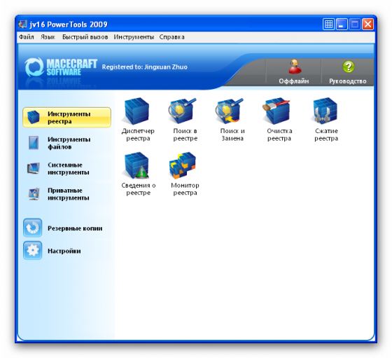 jv16 PowerTools 2009 - это одна из лучших программ для работы с системным реестром и поддержания в оптимальном состоянии. Включает в себя инструменты для работы с реестром: мощный менеджер реестра - позволяет работать со списком программ из автозагрузки и деинсталляции, со списком зарегистрированных в системе типов файлов, расширений, контекстным меню IE (с тем, в которое часто вставляют свои пункты менеджеры закачек) и некоторыми другими. Этот менеджер часто помогает вручную удалить остатки после автоматической очистки реестра программы. Возможно использование в локальной сети.