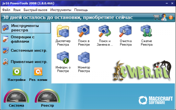 jv16 PowerTools 2008 - это одна из лучших программ для работы с системным реестром и поддержания в оптимальном состоянии. Включает в себя инструменты для работы с реестром: мощный менеджер реестра - позволяет работать со списком программ из автозагрузки и деинсталляции, со списком зарегистрированных в системе типов файлов, расширений, контекстным меню IE (с тем, в которое часто вставляют свои пункты менеджеры закачек) и некоторыми другими. Этот менеджер часто помогает вручную удалить остатки после автоматической очистки реестра программы. Возможно использование в локальной сети.