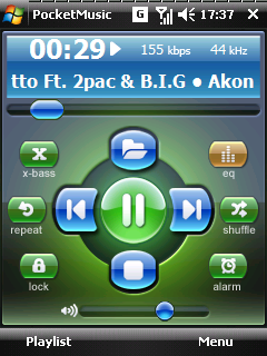 Pocket Music Player продвинутый аудио-плеер с 10-полосным эквалайзером проигрывает музыку в форматах MP3, Ogg Vorbis и WMA. Есть вариант интерфейса с крупными кнопками, ориентированный на работу в горизонтальном положении экрана. Поддержка скинов Winamp. На экране Today можно разместить «органы управления» плеером. Улучшено качество работы эквалайзера (он оптимизирован для работы на процессорах XScale). Также программа Pocket Music Player «научилась» запоминать, на каком месте было остановлено воспроизведение в прошлый раз. А еще есть возможность автоматического сканирования всех папок на наличие аудио-файлов.