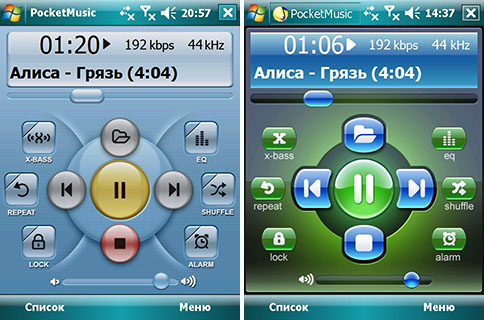 PocketMusic Player - продвинутый аудио-плеер с 10-полосным эквалайзером проигрывает музыку в форматах MP3, Ogg Vorbis, WMA, ACC. Есть вариант интерфейса с крупными кнопками, ориентированный на работу в горизонтальном положении экрана.