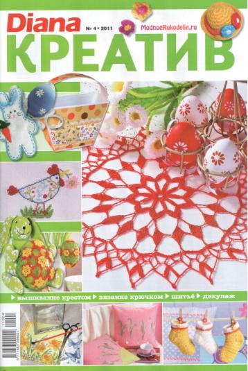 Журнал для любительниц рукоделия: вышивка, вязание крючком (салфетки, детские носочки), декупаж (украшение пасхальных яиц), аппликации.