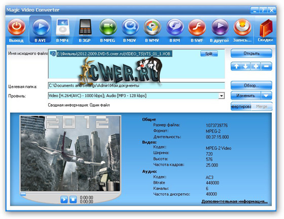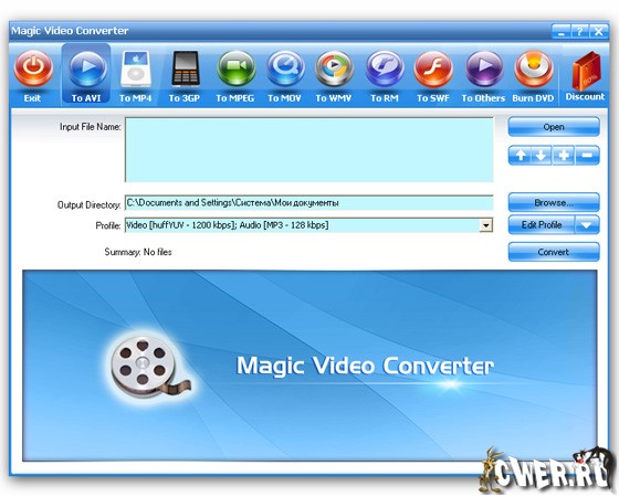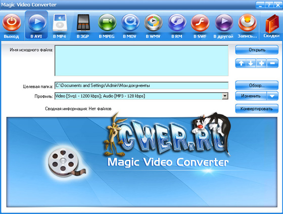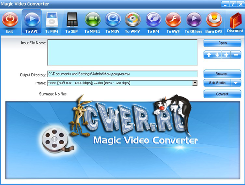 Magic Video Converter - многофункциональный конвертер со встроенным редактором и рекордером, который поможет вам преобразовать нужный файл в определенный формат: AVI, MPEG, MPEG 1, MPEG 2, MPEG 4, VCD, DVD, SVCD, RMVB, RM, WMV и другие видео форматы.