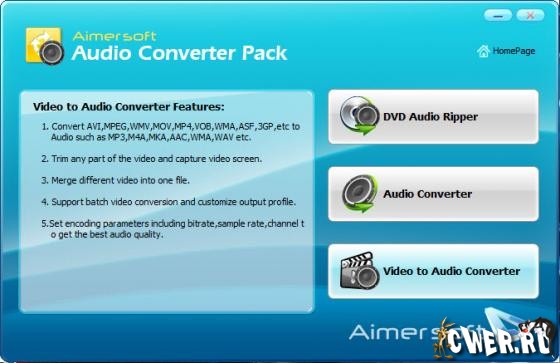 Aimersoft Audio Converter Pack - это один из лучших мультимедиа пакетов, состоящий из трех утилит: DVD Audio Ripper, Audio Converter и Video to Audio Converter. Эти утилиты помогут вам извлечь из DVD аудиотреки и сохранить их в форматах MP3 и WAV, конвертировать аудио файлы между собой, а также извлекать аудио поток из видео файлов.
