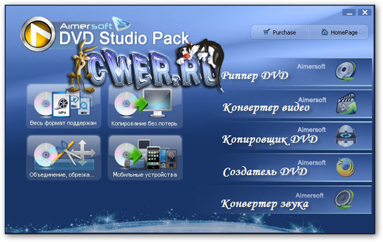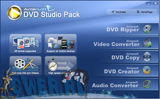 Aimersoft DVD Studio Pack - один из лучших мультимедиа пакетов, состоящий из четырех утилит: Aimersoft DVD Ripper, Aimersoft Video Converter, Aimersoft DVD Creator и Aimersoft Audio Converter. Эти утилиты помогут Вам сделать рип DVD, конвертировать видео и аудио файлы или записать эти файлы на DVD диск.