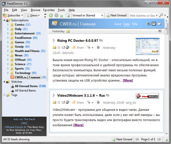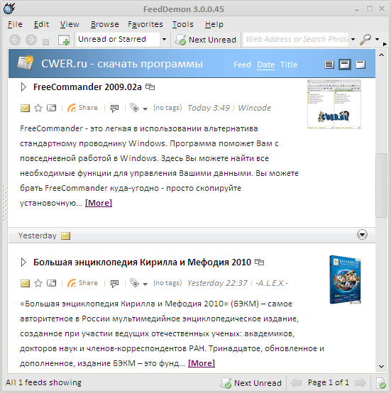 Вышла новая версия FeedDemon - одна из самых популярных программ для получения новостей с сайтов по технологии RSS и XML. По сравнению с обычным просмотром сайтов с помощью браузера, технология RSS имеет два существенных плюса - возможность практически полной автоматизации и значительное уменьшение обьема скачиваемых данных за счет отсутствия в получаемых новостях рекламы (нет ни баннеров, ни чего-либо еще).
