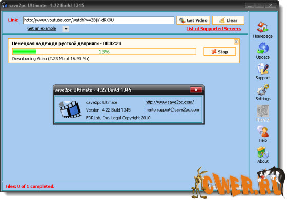 save2pc - это крайне простая в использовании утилита, которая позволяет сохранять видео с известного файлового хранилища YouTube и Google Video. Просто вставьте ссылку на нужный файл в окошке программы, укажите папку для сохранения видео, а все остальное save2pc сделает сама, вы же в результате получите интересующий вас .avi, .mpeg, .flvG файл или файл в мобильном формате mov, mp4, 3gp, mp3, wav. В программе возможно просматривать видео без дополнительных кодеков и скачивать нескольких файлов одновременно.