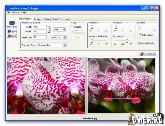 Reshade Image Enlarger - программа для увеличения Ваших фотографий с уникальным алгоритмом работы не имеющим аналогов в данном сегменте программного обеспечения. Программа имеет как полностью автоматический режим работы, так и дает возможность плавно контролировать весь процесс увеличения в ручном режиме. Reshade позволяет масштабировать изображение до 2000% с минимальной потерей качества что дает вам возможность "вытягивать" даже самые маленькие фотографии до нужных размеров, при этом снимок останется такой же реалистичный как и оригинал.