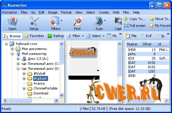 Konvertor - утилита для просмотра (проигрывания) и преобразования графических, текстовых, аудио и видеофайлов. Перечислить все форматы, с которыми может работать Konvertor, весьма затруднительно - их более семисот, включая около пяти десятков фильтров для обработки изображений (перечень всех поддерживаемых форматов занимает четыре веб-страницы сайта разработчика). Не менее долго придется перечислять и все возможности этой программы, поэтому отмечу лишь две из них: умение работать в пакетном режиме (без оплаты позволяет конвертировать только пять файлов одновременно) и из командной строки. Кстати, возможности по конвертированию можно расширить плагинами.