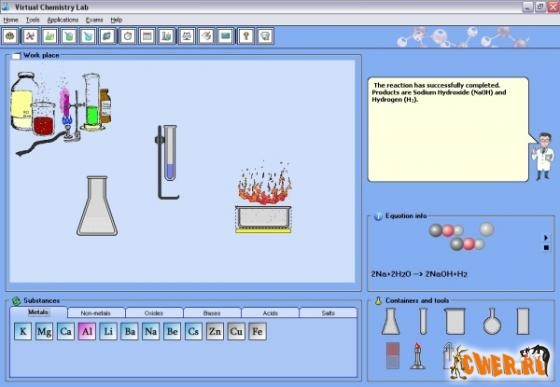 Программа представляет из себя виртуальную химическую лабораторию со множеством возможностей. Virtual Chemistry Lab является полезным инструментом для преподавателей, студентов и всех тех, кто просто интересуется химией. Программа интуитивно понятна: имеется так называемый рабочий стол и две "полки" - для инструментов и химикатов. Чтобы провести опыт, пользователь должен поставить на стол необходимые инструменты и поместить в них химикаты. Программа имеет базу данных реакций и может визуально показывать большинство из них. Способ, каким в этой программе ставятся эксперименты, очень напоминает работу реальной лаборатории. В программе есть "помощник", который уведомляет обо всех изменениях, происходящих в программе.