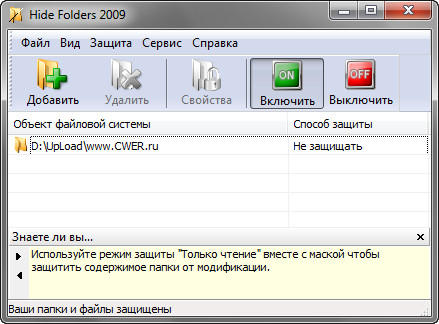 Hide Folders 2009 - это удобный инструмент для сокрытия вашей конфиденциальной информации от посторонних. Программа позволяет скрывать целые папки на компьютерах под управлением Windows 2000/XP. Очень удобна и проста в использовании, достаточно просто перетащить скрываемую папку в окно программы и нажать всего одну кнопочку.
