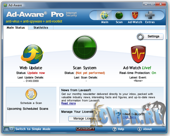 Lavasoft Ad-Aware Anniversary 2009 Professional - предназначена для поиска и устранения шпионских модулей. При своей работе Ad-Aware сканирует оперативную память, файлы на жёстком диске и определяет в них программы-шпионы и запущенные вредоносные процессы.