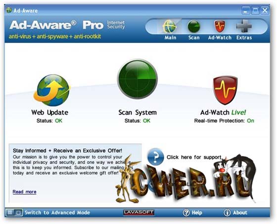 Lavasoft Ad-Aware – это продукт, созданный для обеспечения надежной защиты компьютера от известных угроз – кражи личных данных, агрессивной рекламы, сайтов-паразитов, мошеннических программ, некоторых традиционных троянов, номеронабирателей, вредоносных программ (Malware), браузерных "перехватчиков" (Browser hijackers) и шпионских компонентов.