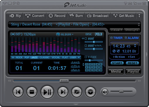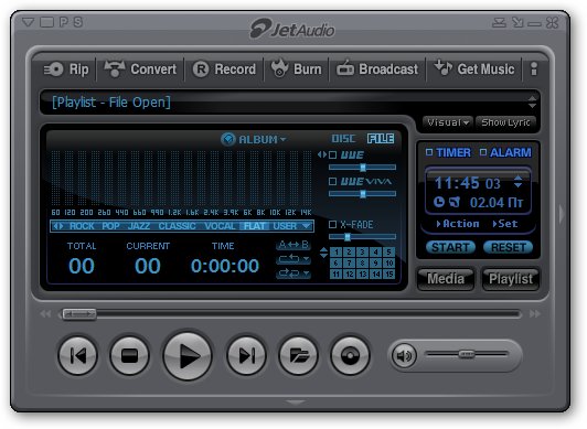 JetAudio — это универсальный проигрыватель музыкальных и видео файлов, риппер, конвертер и т.д., в общем, все в одном комплекте. Программа поддерживает практически все музыкальный форматы, умеет проигрывать MP3, MP2, WAV, MID, REAL AUDIO/VIDEO, S3M, MOD, MPG, AVI, MOV, Video/Audio CD, RealPlayer G2 и некоторые другие форматы мультимедийных файлов. Позволяет записывать аудио компакт-диски или копировать их содержимое на жесткий диск ПК. Есть возможность накладывать на композиции различные эффекты, поддерживается синхронизация для караоке, имеется эквалайзер, конвертер форматов, редактор тэгов, кроссфейдинг, субтитры и т.д.