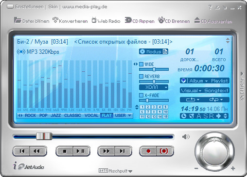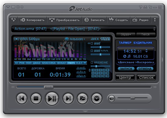 jetAudio - популярный проигрыватель мультимедиа файлов. Программа поддерживает огромное число форматов, среди которых: WAV, MP3, MP3Pro, OGG, WMA, MPG, AVI, WMV, MIDI, RM и другие. При помощи этой программы можно не только слушать и смотреть медиафайлы, а также накладывать звуковые эффекты, изменять скорость просмотра видео, оцифровывать аудио диски, преобразовывать файлы из одного формата в другой и многое другое. Разработкой данной программы занимается компания COWON известная в первую очередь своими аудио-плеерами (материальными). Такой функциональности, как у бесплатной версии плеера jetAudio подчас не бывает и у платных проигрывателей. Кроме всех своих функций, данный плеер обладает очень симпатичным и удобным интерфейсом, а также поддерживает работу с субтитрами и Flash-плеерами.