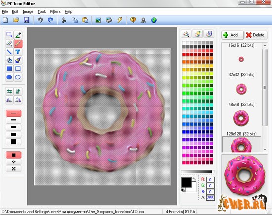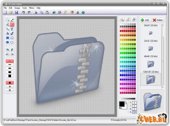 Небольшая, но очень удобная утилита для создания и редактирования иконок. Имеет все необходимые для профессиональной работы инструменты. Greenfish Icon Editor Pro может работать с форматами JPEG, BMP, XPM, PNG, GIF, CUR; сохранение возможно в формате ICO с размером до 256х256 и глубиной цвета 32 бит. Пользователей, которые любят создавать курсоры, порадует поддержка формата ANI (анимированные курсоры); возможен импорт GIF анимации или самостоятельное создание покадровой анимации.
