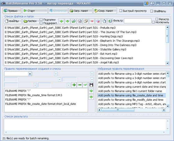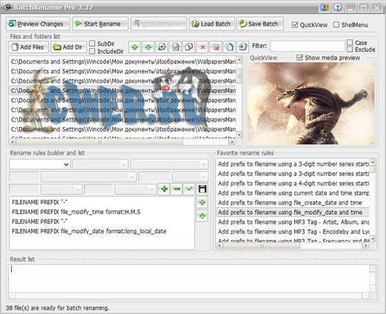 BatchRename Pro – программа для пакетного переименования файлов и папок. BatchRename Pro может переименовывать файлы, используя EXIF-мета-данные фотографий, ID3-тэги музыкальных файлов, параметры изображений (разрешение, количество цветов, дата, формат и т.д.), а также другие атрибуты.