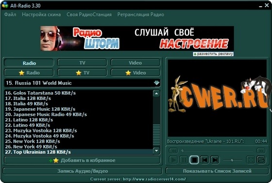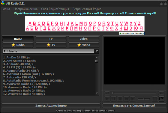 Программа для прослушивания радиостанций и просмотра ТВ-каналов, вещающих через интернет с возможностью записи аудио и видео потока. После установки All-Radio у вас появится доступ к 2500 радиостанциям и 1200 телевизионным каналам со всех уголков планеты (более 100 стран). В программе собраны практически все РАДИО и ТВ станции, вещающие на русском языке. Положительным моментов является то, что вам не надо обновлять программу в целях пополнения списка станций. При запуске последние списки автоматически загружаются с сервера разработчиков.
