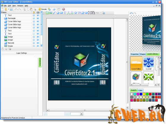 TBS Cover Editor - удивительная программа для создания и редактирования зримых виртуальных обложек коробок для ваших представляемых продуктов. Основная отличительная особенность TBS Cover Editor от других подобных программ, заключается в том, что коробка во время редактирования представлена как развёртка всех сторон одновременно с отображением ее готового трехмерного вида мгновенно меняющегося согласно вашего редактирования. Ещё одно не мало важное достоинство редактора - это базово заложенный богатый набор шаблонов вида коробок. Помощник программы после выбора вами понравившегося шаблона и ввода имени продукта и фирмы, поведет вас за руку до конечного результата - готовой коробки.