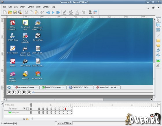 ScreenFlash это самый легкий и эффективный инструмент для захвата звука и действий в любой части экрана и создания презентаций, интерактивных файлов помощи к программным продуктам, с добавлением элементов мультипликации в систему помощи. После снятия ролика можно отредактировать скорость его воспроизведения, вырезать кадры, добавить комментарии, удалить курсор с экрана...