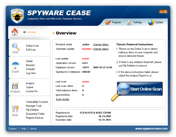 Spyware Cease - выдающаяся антишпионская программа для Windows, которая может быть использована для эффективной защиты вашего компьютера от различных вредоносных программ. Программа поможет вам защититься от троянских программ, шпионских и рекламных модулей, кейлоггеров, червей, руткитов, программ для кражи паролей и многих других вредоносных программ. Spyware Cease просканирует, удалит и заблокирует найденные вредоносные приложения. Утилита является мощным приложением для отлова и уничтожения вредоносных программ, но, при этом, программа не потребляет много системных ресурсов. С помощью этой программы вы не только сможете защитить свой компьютер от вирусов и троянских программ, но и с легкостью повысить производительность вашей системы.