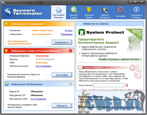 Spyware Terminator - программа для защиты компьютера от различных вредных модулей - spyware, adware, кейлоггеров и других троянов. Имеет резидентный монитор, который в реальном времени проводит мониторинг системы и предотвращает попытки проникновения на компьютер вредоносного ПО. Кроме этого, имеющийся в программе сканер поможет отыскать и поместить в "карантин" или удалить уже внедренные объекты. Работает программа очень быстро... Spyware Terminator имеет опцию автоматического обновления своих баз через Интернет, а также умеет производить проверку по расписанию.