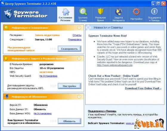 Spyware Terminator - программа для защиты компьютера от различных вредных модулей - spyware, adware, кейлоггеров и других троянов. Имеет резидентный монитор, который в реальном времени проводит мониторинг системы и предотвращает попытки проникновения на компьютер вредоносного ПО. Кроме этого, имеющийся в программе сканер поможет отыскать и поместить в "карантин" или удалить уже внедренные объекты. Работает программа очень быстро... Spyware Terminator имеет опцию автоматического обновления своих баз через Интернет, а также умеет производить проверку по расписанию.