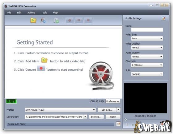 Программа для преобразования формата видео формата MOV (Quicktime) в форматы AVI, MPEG, WMV, DivX, MP3, WAV. ImTOO MOV Converter позволяет быстро производить конвертирование, поддерживает пакетное преобразование и многопоточность. Имеется встроенная возможность установки временного промежутка, что позволяет преобразовывать любые фрагменты видеофайлов.