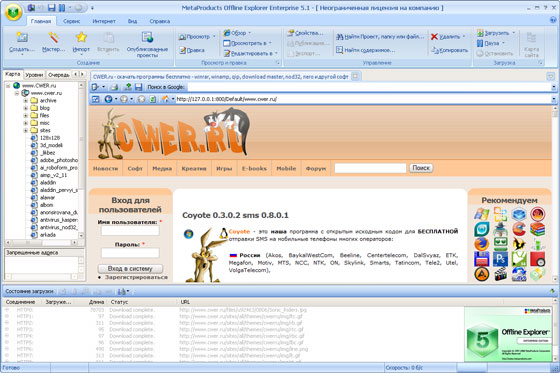 Offline Explorer Enterprise - мощнейшая программа, позволяющая скачивать как отдельные файлы, так и целые веб-сайты (HTTP, FTP и HTTPS) на жесткий диск для их последующего офф-лайн просмотра как на отдельном компьютере, так и пользователями целой локальной сети. Используя Offline Explorer Enterprise, вы можете одновременно качать неограниченное количество выбранных вами Web, FTP и HTTPS сайтов для дальнейшей работы с ними.