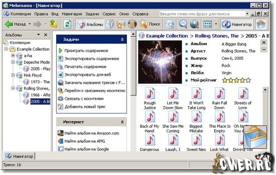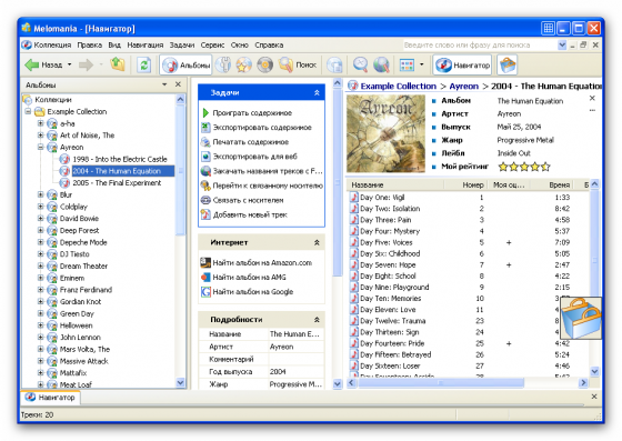 Melomania - это необычайно удобная программа для Windows, предназначенная для организации и каталогизации любых музыкальных коллекций, от виниловых дисков до MP3, и предоставляющая Вам широкий ряд возможностей для работы с музыкальной базой данных, включая автоматическое добавление цифровых треков, закачку информации из Интернет, учет отданных дисков и многое другое.