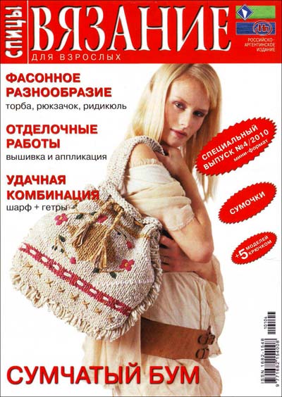 Ежемесячный журнал по вязанию спицами. В номере представлены разнообразные модели вязаных сумок. Изделия проиллюстрированы фотографиями, подробными описаниями по выполнению работы, точными выкройками и схемами узоров.
