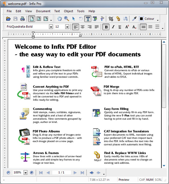 Infix Pro позволяет редактировать и переформатировать текст (даже в нескольких колонках), манипулировать графикой, изображениями и страницами в любых PDF-файлах. С помощью Infix Pro можно обновлять бюллетени, брошюры, технические руководства и т.д., созданные в формате PDF, без потребности иметь оригинальный документ и шрифты, которые в нем использовались. С помощью мощной функции поиска и замены можно заменять отдельные части (верхний и нижний колонтитулы, например) сразу во всех страницах документа.