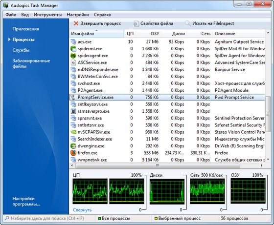 Auslogics Task Manager покажет сколько памяти, процессора, диска и интернет трафика используется каждым процессом на компьютере. Это поможет Вам найти и уничтожить "прожорливые" процессы и троянцев, прячущихся в обычные файлы вроде explorer.exe. Программа также покажет запущенные на Вашем компьютере сервисы. Также уникальной является способность программы отображать список заблокированных файлов, и какие программы открыли данные файлы. Это незаменимо для тех, кто хочет удалить или скопировать заблокированные файлы, а также полезно, если Вы не знаете почему данный файл был заблокирован.