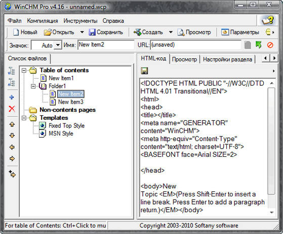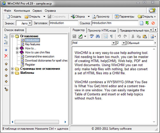 Softany WinCHM - программа для создания файлов справки, книг или журналов в форматах HTML-справка (CHM), веб-справки, PDF и документах Word. Страницы справок создаются в удобном редакторе, большим плюсом является то, что она не использует сторонних компиляторов, при этом имеет сравнительно небольшой размер. Особенности: встроенный визуальный HTML-редактор; автопоиск html-файлов и автосоздание оглавления; редактор оглавлений и значков; визуальный дизайнер CHM.
