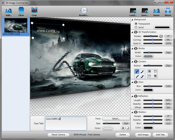 3D Image Commander - это полнофункциональная программа, которая позволит вам создавать непревзойденные эскизы страниц с различными 3D стилями и эффектами. Вы также сможете накладывать водяные знаки на ваши творения. Создавайте изображения с такими эффектами, как трехмерная перспектива и трехмерная кривая, отражение, свечение, уголки и мазки. Программа поддерживает такие форматы, как BMP, JPG, GIF, PNG, TIFF и PSD.