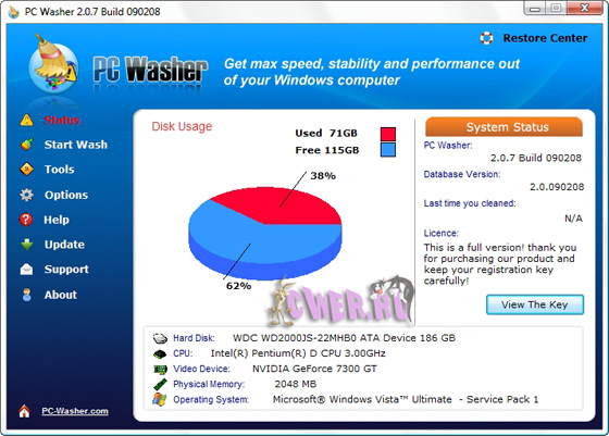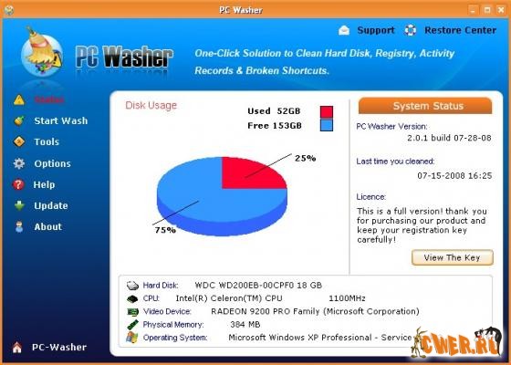 PC Washer - программа, которая просканирует вашу систему и выдаст в процентном отношении её захламленность для принятия пользователем решения. Программе известно более 80 видов ненужных файлов, которые он готов удалить переместив их в корзину. PC Washer заставит вашу систему стать более устойчивой и работать быстрее, автоматически очищая ее от: временных интернет файлов и файлов оставленных программами; ненужных логов и файлов резервного копирования; пустых (нулевых) файлов; index.dat файлов; битых ярлыков; недействительных записей реестра и т.д.