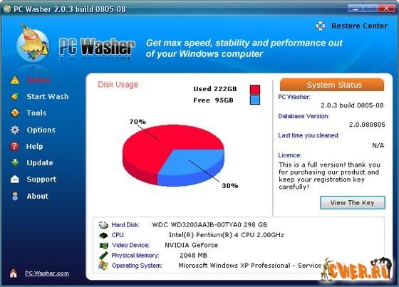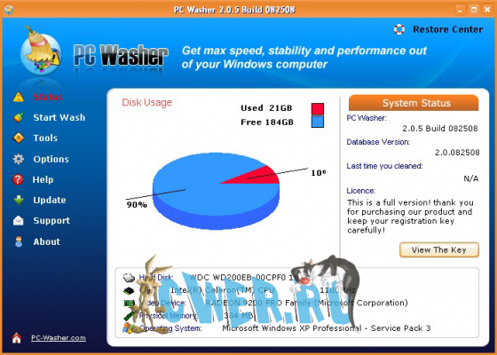 PC Washer - данная программа просканирует вашу систему и выдаст в процентном отношении её захламленность для принятия пользователем решения. Программе известно более 80 видов ненужных файлов, которые он готов удалить переместив их в корзину. PC Washer заставит вашу систему стать более устойчивой и работать быстрее, автоматически очищая ее от: временных интернет файлов и файлов оставленных программами; ненужных логов и файлов резервного копирования; пустых (нулевых) файлов; index.dat файлов; битых ярлыков; недействительных записей реестра и т.д.