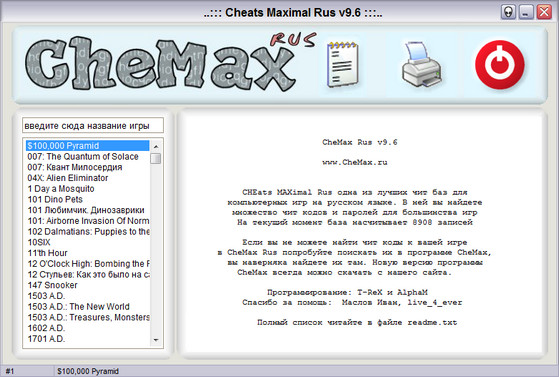 CheMax - наибольшая из известных на данный момент программ, которые являют собой базу данных с кодами для игр. Простой и красивый интерфейс, малый размер, и при этом огромное количество представленных игр. Особенностью базы является отсутствие в ней хинтов и прочей “отсебятины“, вашему вниманию представлены только коды (cheats, hex-cheats) и пароли (passwords).