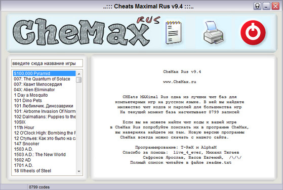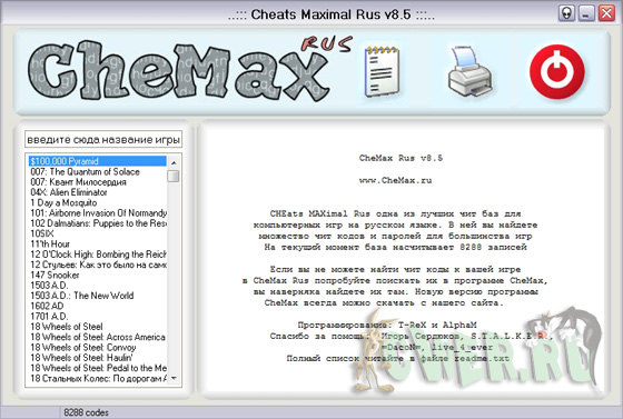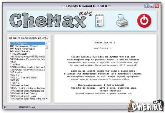 CheMax - наибольшая из известных на данный момент программ, которые являют собой базу данных с кодами для игр. Простой и красивый интерфейс, малый размер, и при этом огромное количество представленных игр. Особенностью базы является отсутствие в ней хинтов и прочей “отсебятины“, вашему вниманию представлены только коды (cheats, hex-cheats) и пароли (passwords).