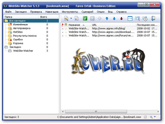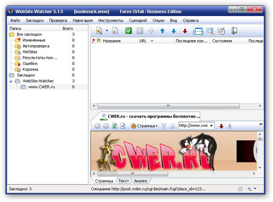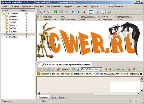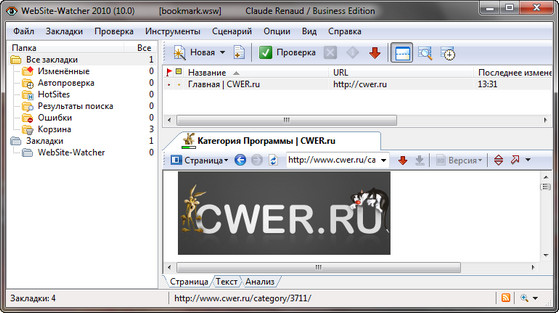 WebSite-Watcher - мощная программа для мониторинга сайтов на предмет их обновления. При обнаружении изменений обновленные страницы сохраняются и на них цветом выделяются все изменения. Для более конкретного контроля за изменением определенной информации возможно использование хорошо настраиваемых фильтров. Программа поддерживает интеграцию с наиболее популярными браузерами - Internet Explorer, Firefox, Netscape и Opera.