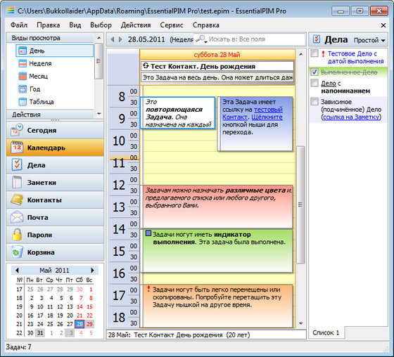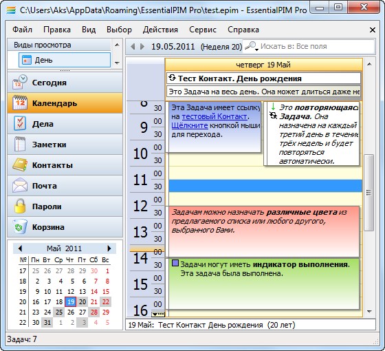 EssentialPIM - это комплексный менеджер персональной информации, отличающийся продуманным интерфейсом и обилием функций. Включает в себя средства для работы с календарем, списком задач, заметками и контактами. Среди особенностей - широкие возможности для печати, импорта и экспорта информации, возможность запуска с переносных USB накопителей (включая U3 SmartDrive- сертифицированную версию), синхронизация с карманными компьютерами и смартфонами работающими под управлением WindowsMobile, PalmOS. Поддерживается 128-битное шифрование, экспорт/импорт данных из MS Outlook, Windows Address Book, расширенный поиск, различные опции печати. Имеется инструмент для хранения контактов с неограниченным количеством полей.