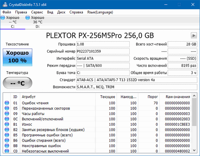 CrystalDiskInfo – следит за «здоровьем» жестких дисков, поддерживающих технологию самодиагностики S.M.A.R.T. Осуществляет мониторинг и дает общую оценку состояния вашего диска. Также выдаёт подробную информацию о жестких дисках, установленных в компьютере (прошивка, серийный номер, стандарт, интерфейс, общее время работы и др.) и выводит параметры атрибутов S.M.A.R.T. (ошибки чтения, производительность, запуски/остановки шпинделя, время поиска дорожки, количество циклов включения-выключения, ошибки секторов и многое другое). Может выводить в трее индикаторы с температурой каждого накопителя, строит график изменения температур. Позволяет управлять настройками производительность/шум.