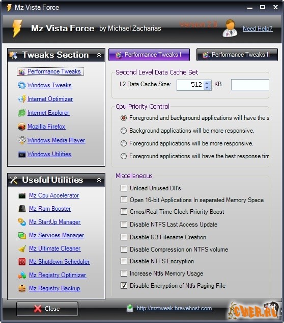 Mz Vista Force 2.1.2 - Утилита для настройки Windows Vista на оптимальную работу. При помощи Mz Vista Force можно повысить общую производительность системы, оптимизировать интернет-соединение, отредактировать автозагрузку, быстро добраться до панели управления службами, оптмизировать системный реестр, изменить некоторые из "скрытых" параметров системы, очистить историю и кеш браузера, настроить Windows Media Player и т.д. Для работы требуется .Net Framework 2.0.
