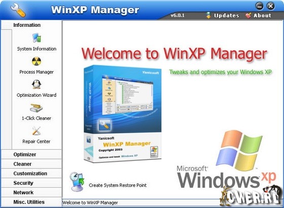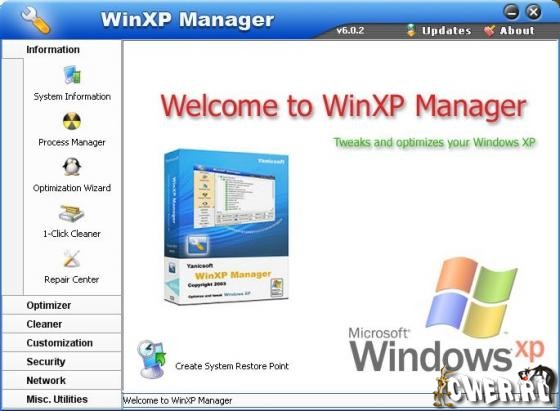 WinXP Manager - это оптимизатор и настройщик операционных систем Windows XP. Программа предоставляет детальную информацию об установленной системе и аппаратном обеспечении, производит оптимизацию работы Windows, повышает скорость загрузки и выключения ПК, позволяет повысить быстродействие запущенных мультимедиа-программ, умеет очищать жесткий диск и реестр от ненужных файлов и следов старых программ, позволяет настроить систему безопасности и сетевые соединения.