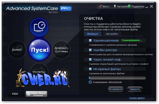 Благодаря возможностям Advanced SystemCare Pro (в прошлом Advanced WindowsCare) вы сможете очистить ПК от шпионского и рекламного ПО, обнаружить и заранее устранить возможные угрозы и бреши в системе безопасности ОС, исправить ошибки в системном реестре, очистить временные и ненужные файлы, управлять списками автозагрузок, оптимизировать работу систем. Все для оптимизации, настройки, стабильности, защиты приватности и повышения производительности компьютеров, находящихся под управлением операционными системами Windows 2000/XP.