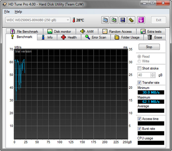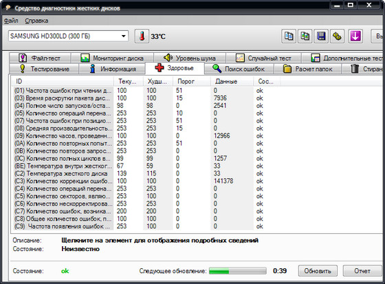 HD Tune Pro - программа для планомерного детального тестирования текущей работоспособности и производительности жестких дисков с различными интерфейсами (SCSI, SATA или IDE), а так же карт памяти и flash-дисков. Программа производит замер и наглядно отображает такие параметры накопителей, как скорость передачи данных, время чтения, записи и время доступа, уровень загрузки процессора, температуру винчестера, показывает в виде сводной таблицы данные поставляемые S.M.A.R.T, позволяет сканировать жесткие диски и другие накопители на предмет наличия ошибок, выдает информацию о версии firmware, серийном номере, объеме диска и подробности по потребителям полезной площади, его КЭШа, возможном и активном режимах передачи данных и т д. и т.п.