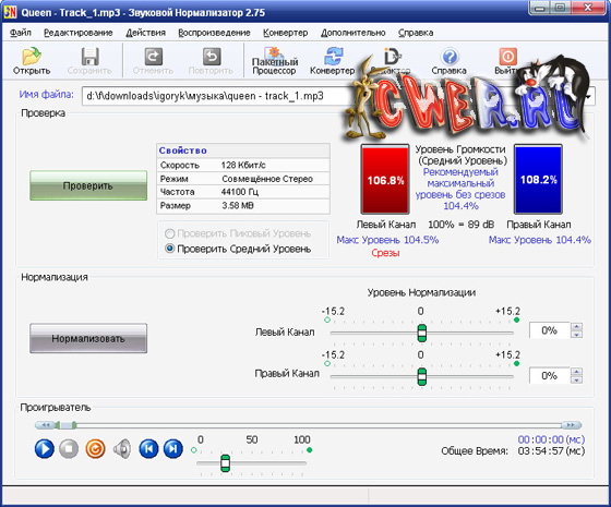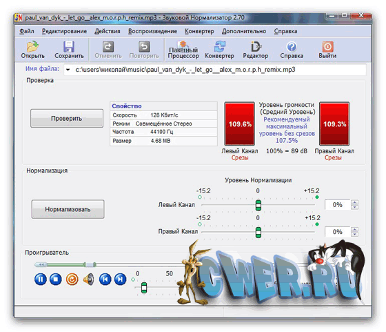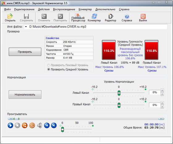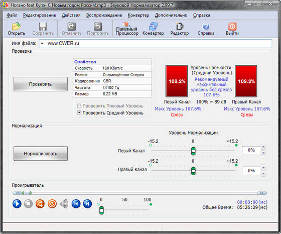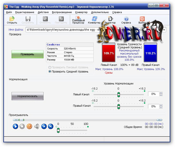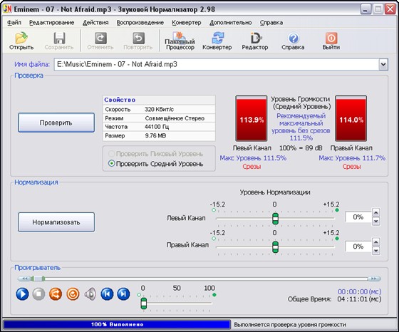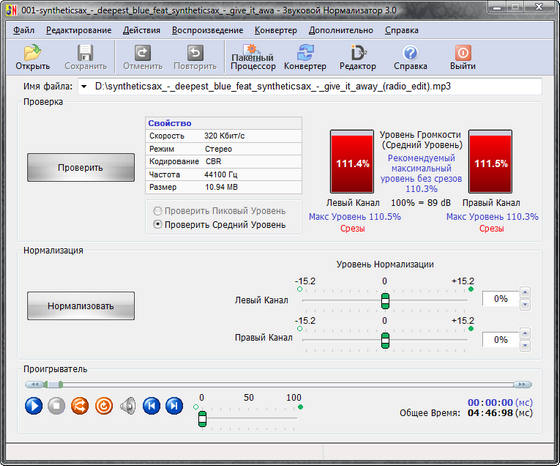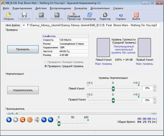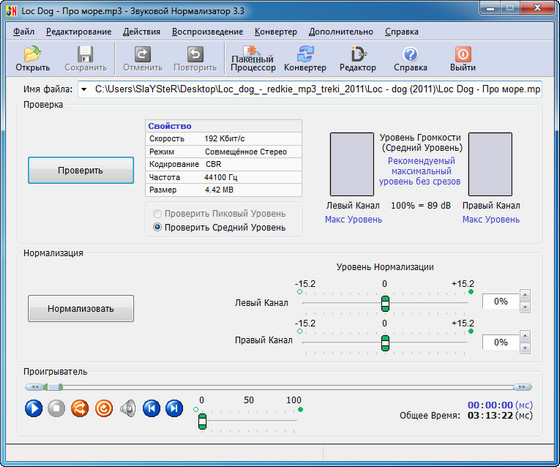 Что больше всего раздражает в музыке, так это недостаточная или избыточная громкость записанного трека. Sound Normalizer - звуковой нормализатор звука, предназначенный для повышения или восстановления уровня громкости музыкальных WAV и MP3 файлов, причем отдельно по каждому каналу. Уровень громкости отображается в графическом виде с использованием процентного значения. WAV-нормализация выполняются по пиковому уровню(пиковая нормализация), а MP3-нормализация по стандарту Replay Gain. Алгоритм Replay Gain работает, используя психоакустический анализ обрабатываемого файла для определения воспринимаемого человеком уровня громкости. Replay Gain основан на среднеквадратическом анализе Root Mean Square(RMS) и сама MP3-нормализация производится по среднему уровню громкости(RMS нормализация). Эта программа проста в использовании и даёт быстрые и превосходные результаты качественного звука. Имеется возможность пакетной обработки.