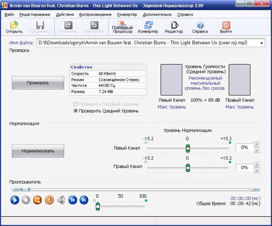 Sound Normalizer - звуковой нормализатор звука, предназначенный для повышения или восстановления уровня громкости музыкальных Wav и Mp3 файлов, причем отдельно по каждому каналу. Уровень громкости отображается в графическом виде с использованием процентного значения. Эта программа проста в использовании и даёт быстрые и превосходные результаты качественного звука. Имеется возможность пакетной обработки.