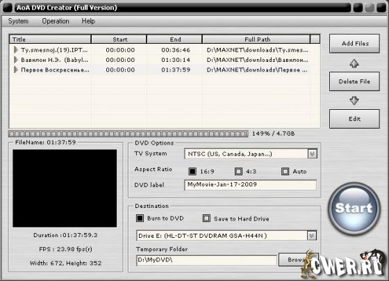 AoA DVD Creator - программа предназначена для создания DVD фильмов из обычных видеофайлов. Обеспечит Вам удобство в создании или преобразовании AVI, WMV/ASF, FLV (Flash Video), MP4, 3GP, MPEG/MPG, DAT и MOV в DVD, которые Вы можете смотреть на вашем домашнем DVD плеере. С AoA DVD Creator Вы сможете легко превратить каникулы, свадьбу и семейные кинофильмы в DVD диски, которые потом можно просматривать вместе с вашими друзьями и семьей!